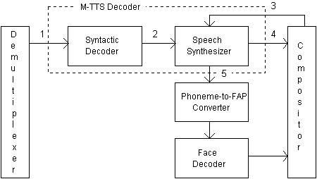 When decoder receives the M-TTS bitstream it is first demultiplexed (1) and sent to the syntactic decoder which specifies the bitstream sent to speech synthesizer (2) including some of the following: The input type of the M-TTS data, control commands stream, input text to be synthesized, and some additional information, such as prosodic parameters, lip-shape patterns, and information for the trick mode operation.
