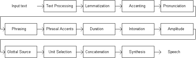 The text processing module handles the end-of-the-sentence detection, text normalization (expansion of numbers, abbreviations etc.), and makes some grammatical analysis. The Accenting module handles the assignment of levels of prominence to various words in the sentence. The pronunciation module handles the pronunciation of words and names and the disambiguation of homographs. The phrasing module contains the breaking of long stretches of text into one or more intonational units. The duration determines the appropriate segmental durations for phonemes in the input on the basis of linguistic information. Intonation module computes the fundamental frequency contour. The glottal source determines the parameters of the glottal source (glottal open quotient, spectral tilt, and aspiration noise) for each sentence. The unit selection module handles the selection of appropriate concatenative units given the phoneme string to be synthesized. Finally, the selected units are concatenated and synthesized (Santen et al. 1997).
