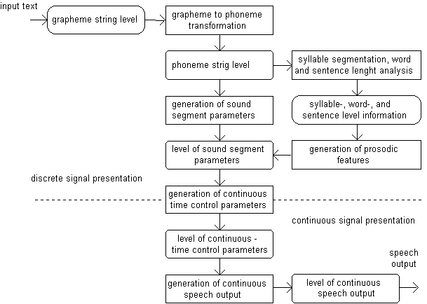 The speech synthesis process can be divided in high-level and low-level synthesis. A low-level synthesizer is the actual device which generates the output sound from information provided by high-level device in some format, for example in phonetic representation. A high-level synthesizer is responsible for generating the input data to the low-level device including correct text-preprocessing, pronunciation, and prosodic information. Most synthesizers contain both, high and low level system, but due to specific problems with methods, they are sometimes developed separately.